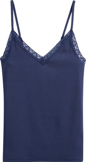 Delicate lace adds intrigue to a V-neck camisole that s cut from a cotton-forward blend and topped with adjustable straps.