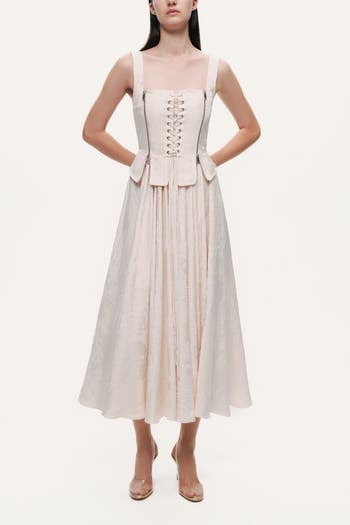 Strike a bold silhouette in this jacquard-textured midi dress, blending romantic structure with modern edge. Featuring a square neckline and wide straps, the corset-style bodice is reinforced with internal boning and elevated by a lace-up front threaded through metallic eyelets. A softly pleated A-line skirt flows effortlessly from the cinched tabbed waist, while the back zip ensures a flawless fit. Fully lined for comfort, this tailored piece brings elegance with just the right amount of attitude.