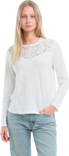 A feminine take on an everyday essential. Designed in our signature slub fabrication, this long-sleeve tee features a delicate lace yoke and a button-front detail that adds soft texture and understated charm. Lightweight, breathable, and effortlessly versatile—perfect for elevating your daily rotation. Crew neckline with button-front detail Lace yoke for a delicate, feminine touch Body: 100% cotton Lace: 90% cotton, 10% nylon Signature slub fabrication Model is wearing a size Small.