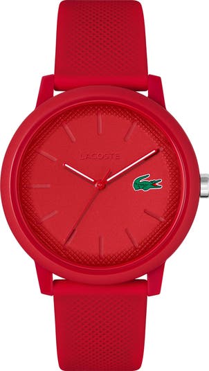 A monochrome theme and textured detail enhance a sporty silicone strap watch marked with etched indices and a signature croc positioned at three-o -clock.