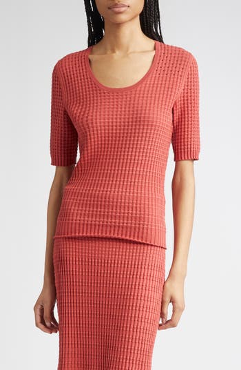 A mix of rib and pointelle stitching enriches the texture of this wardrobe-staple sweater showcased with a scoop neck and scalloped trim.