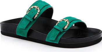 Etched buckles add modern charm to the adjustable straps on a weekend-ready slide sandal grounded by a cushioned footbed and durable rubber sole.