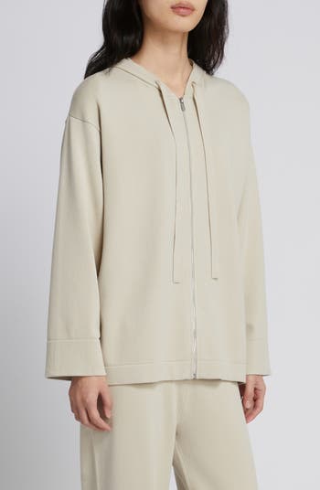 Level up your laid-back look in a neutral-hued hoodie knit from a lightweight yarn blend.