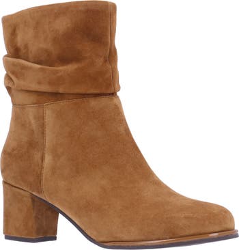 Delicate ruching elevates the shaft on a creamy suede bootie set on a cushioned footbed and wrapped block heel.