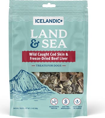 ICELANDIC+ LAND SEA WILD-CAUGHT COD SKIN FREEZE-DRIED RAW BEEF LIVER DOG TREATS – the healthy, grain-free, 100% natural dog treats your pup will love. Crafted with sustainably sourced proteins, these treats offer a unique taste and texture variety, combining diced grass-fed beef liver and crunchy cod skin. Each bite is packed with protein, vitamins and omega-3s, supporting your dog s health and vitality. With only two ingredients, these treats are ideal as a snack, training treat or food topper. HIGHLIGHTS: Raw Beef Liver – grass-fed, rich in iron and vitamins to support your dog’s health. • Freeze-dried in small batches, packed with raw, whole-food nutrition. • Gently air-dried wild-caught cod skin loaded with naturally occurring omega 3’s for eye, brain skin coat support. • Just 2 ingredients. • 100% natural, no additives, preservatives or fillers. • Easily digestible, low calorie treat. • Flavor and texture variety to keep dogs interested. • Perfect snack for dogs with food sensitivities. • Grain-free, gluten-free.
