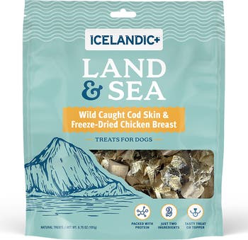 ICELANDIC+ LAND SEA WILD-CAUGHT COD SKIN FREEZE-DRIED RAW CHICKEN BREASTS DOG TREATS – the healthy, grain-free, 100% natural dog treats your pup will love. Crafted with sustainably sourced proteins, these treats offer a unique taste and texture variety, combining diced chicken breast and crunchy cod skin. Each bite is packed with protein, vitamins and omega-3s, supporting your dog s health and vitality. With only two ingredients, these treats are ideal as a snack, training treat or food topper. HIGHLIGHTS: • Raw chicken breast - lean protein with vitamins and minerals to support your dog’s health • Freeze-dried in small batches, packed with raw, whole-food nutrition • Gently air-dried wild-caught cod skin loaded with naturally occurring omega 3’s for eye, brain skin coat support • Just 2 ingredients • 100% natural, no additives, preservatives or fillers • Easily digestible, low calorie treat • Flavor and texture variety to keep dogs interested • Free from added hormones and antibiotics • Perfect snack for dogs with food sensitivities • Grain-free, gluten-free