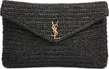 Woven raffia adds satisfying texture to this plump clutch finished with gleaming YSL hardware authenticating the envelope flap.