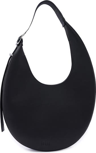 The line s rounded silhouette is taken to its sleekest, most statement-making extent in this crescent-shaped bag that is wide yet slim and shaped from richly peppled leather.