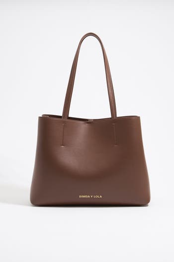Large shoulder bag with leather upper, leather strap and details. Features a metallic BIMBA Y LOLA logo, gold-tone finishes, lobster clasp and zip interior pocket. Interior with engraved logo. Made from recycled leather and responsibly produced polyurethane.