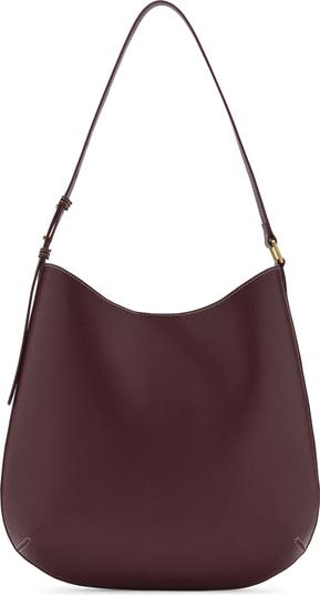 Brushed hardware and contrast topstitching highlight the slim and voluminous profile of a roomy faux-leather bag suspended from an adjustable shoulder strap for versatile wear.