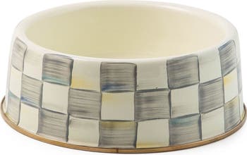 A heavy-gauge steel underbody is strong enough to withstand the mealtime antics of even the hungriest furry friends. Hand-painted check brings a brand-signature look.