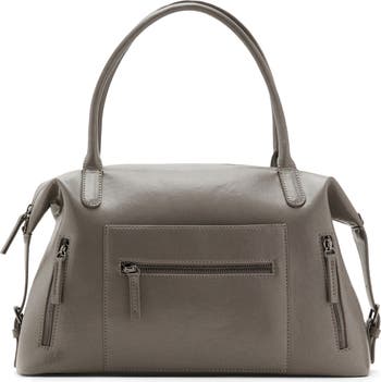 Polished buckles and zippered pockets highlight the voluminous profile of a structured bag shaped from smooth faux leather and suspended from an optional crossbody strap for hands-free wear.