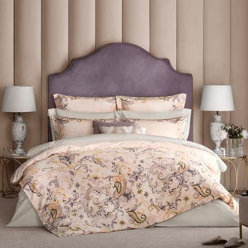 - The warm shades of the set – peach, orange, and olive – are complemented by lilac and purple tones in the pattern