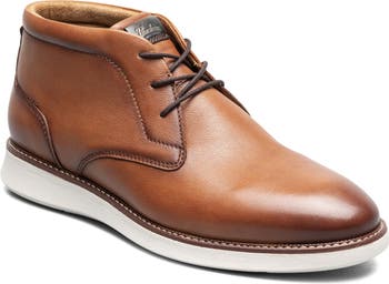 Intricate stitching and a smooth plain toe add timeless sophistication to a burnished leather chukka set on a cushioned insole and flexible rubber sole.