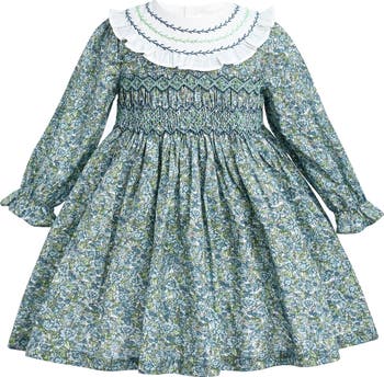 A timeless floral piece with heirloom detailing, this long-sleeved dress features intricate smocking and a full gathered skirt. The crisp white ruffled collar with embroidered green laurel adds a graceful, vintage-inspired finish. Smocked bodice with puff sleeves and gathered cuffs. White scalloped collar with green leaf embroidery for a charming accent.