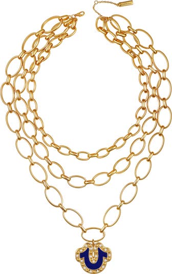 Triple the layers, triple the impact. This True Religion gold chain necklace features oversized links and a bold blue horseshoe pendant, framed in studded crystals. Designed to command attention, it brings signature glam and fearless energy to any look.