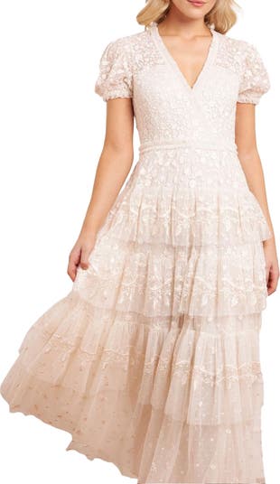 The Layered Lace Ankle Gown is a Needle Thread heritage style featuring exquisite vintage lace-inspired embroidery with floral motifs and trailing leaf and ribbon designs. The flattering wrap front bodice is accented with signature tulle ruffles, while the puff sleeves with elasticated cuffs add a delicate touch. A tiered skirt, crafted from layers of soft tulle, completes the design, offering a romantic and elegant silhouette.