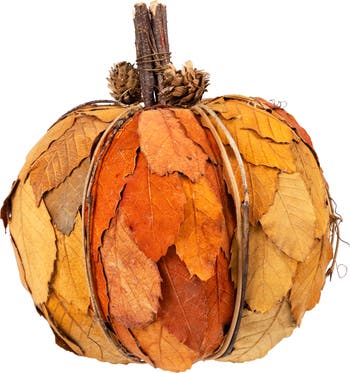 Give your home a warm seasonal accent with this pumpkin decoration, designed to capture the rustic beauty of autumn. Unlike traditional pumpkins, this piece is crafted with authentic orange leaves that form the skin, giving it a realistic texture and vibrant fall color. Natural grapevines create the sections of the pumpkin, lending it a handcrafted look that highlights the essence of Thanksgiving décor. At the top, two real pine cones sit among the detailing, completing the design with a touch of woodland charm. Perfect for tabletops, shelves, mantels, or centerpieces, this fall pumpkin decoration brings the colors of the season indoors. Its natural textures and earthy tones make it a versatile piece that pairs beautifully with other autumn décor, such as gourds, candles, or wreaths. Whether displayed in a dining room, entryway, or living space, it provides a warm harvest feel that instantly makes your home more inviting. Crafted with care for long-lasting use, this artificial pumpkin is a Fall or Thanksgiving decoration you’ll enjoy for many fall seasons to come. Lightweight and easy to style, it’s the perfect accent for Thanksgiving gatherings, a harvest celebration, or simply to highlight the natural beauty of autumn indoors. Product Features: Rustic leafy design crafted with natural and faux materials The pumpkin s ribs and stem are constructed from natural brown twigs Decorated with pinecones Recommended for indoor decorative use only Dimensions: 7.5” high x 7” diameter Material(s): dry leaves/twig/pinecone/foam