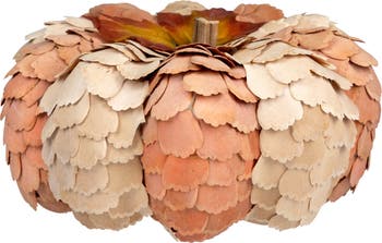 Bring seasonal style to your home with this fall pumpkin, a rustic accent designed to showcase the beauty of autumn. Crafted with beige and orange layered wooden leaves, this pumpkin decoration blends natural tones with warm seasonal colors, making it a versatile piece for any space. The design is topped with a realistic stem accented by yellow and orange leaves, completing the look with a lifelike harvest touch. Perfect for fall decorating, this wooden pumpkin can be placed on a mantel, entryway table, bookshelf, or dining room centerpiece to highlight the spirit of the Thanksgiving season. Its neutral beige layers paired with vibrant orange tones allow it to coordinate beautifully with other autumn décor, such as wreaths, garlands, and candle holders. Lightweight yet durable, this autumn decoration pumpkin can be displayed throughout the entire season, from early fall through Thanksgiving gatherings. Unlike fresh pumpkins, it requires no upkeep and can be reused year after year as part of your traditional seasonal displays. Whether used alone or paired with other harvest-inspired accents, this pumpkin decoration is a timeless way to embrace the warm, inviting atmosphere of autumn inside your home. Features: Designed with layered petal-shaped wooden pieces Topped with a natural twig stem and faux maple leaves Recommended for indoor use only Dimensions: 5.5" high x 10” in diameter Material(s): wood/plastic