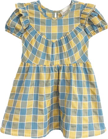 Brighten up her wardrobe with the Leah Dress, a playful yet elegant design perfect for everyday adventures. Featuring a timeless checkered pattern in soft pastel hues of blue, yellow, and muted green, this dress brings subtle sophistication to her day. With delicate ruffled shoulders and a gathered waist that creates a breezy, flared silhouette, it offers effortless style and comfort for any occasion. Fabric Content Care 50% POLYESTER 50% VISCOSE Machine Wash Cold | Line Dry | Do Not Bleach