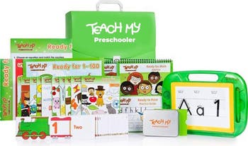 TEACH MY PRESCHOOLER LEARNING KIT is the award winning, all-in-one learning kit designed for preschoolers ages 3+. Screen-free, the kit contains unique and coordinated tools to teach reading, printing, numbers to 100 and early math. From readers and a magic drawing board to flashcards, posters and counters, the kit is full of learning toys to give your mini scholar a head start. Teach My Preschooler promotes kindergarten readiness, fine motor skills, hand eye coordination, parent-child interaction and self-esteem in just 20 minutes a day! Teach My Preschooler Reading. 10 Readers, 60 Flashcards a Reward Tin. Teach My Preschooler Printing: Magic Drawing Board, Transparencies Print Guide. Teach My Preschooler Numbers to 100: Matching Book, Poster, Train Flashcards Foam Numbers. Teach My Preschooler Math: Matching Book, Double Sided Poster, Foam Counters, Equation Signs Counters. OVERVIEW: Screen-Free. Preschool Readiness. All-In-One Kit. Teach Reading, Printing, Numbers to 100, Early Math. 70+ pieces plus teaching guides and storage case. Age 3yrs+ INCLUDES: 10 Readers, 60 Flashcards, 1 Flashcard Reward Tin, 1 Magic Drawing Board, 72 Print Transparencies Printing Guide, 101 Train Flashcards, 2 Posters, 1 Add/Subtract Flip-Book, Foam Numbers, Counters and Equation Signs, Teaching Guide, Storage case