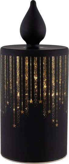 Add a touch of enchantment to your holiday décor with our mesmerizing glass tabletop Christmas candle decoration. Featuring an LED-lighted rainfall design, adorned with star-tipped accents, this captivating centerpiece brings a holiday glow to any setting. Illuminate your home with the warm charm of the season and create magical moments that sparkle and shine. Product Features: Glass Christmas candle decoration Matte black with gold shooting stars Pre lit with warm white micro fairy LED lights On/Off switch located on the bottom Requires 3 AA batteries; not included For indoor use only Dimensions: 8" high x 3.5" diameter Material(s): glass