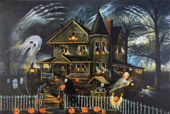 Bring haunting charm to your home with our battery-operated haunted house lighted canvas wall art. The eerie scene showcases a shadowy house surrounded by ghosts, skeletons, and glowing jack-o’-lanterns beneath a moonlit sky. Six LED micro lights illuminate the windows, enhancing the spooky atmosphere with a soft, flickering glow. Ready to hang, this glowing artwork makes the perfect centerpiece for your Halloween display. Product Features: Battery operated Pre-lit with 6 LED lights Bulb size: micro Requires 2 AA batteries not included Battery compartment on the back Convenient on/off switch on the side Comes ready to hang Recommended for indoor use only Dimensions: 15.75"H x 23.75W x .75"D Material(s): canvas/plastic/metal/MDF(medium density fiberboard) Note:Item does not come with a battery cover - open design holds the batteries snugly