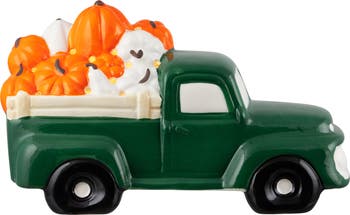 Celebrate autumn in style with this ceramic truck, a festive centerpiece that captures the essence of the fall harvest. This Thanksgiving decoration features a vintage farm truck, carefully detailed to showcase realistic textures and design. The truck’s bed is filled with a bounty of pumpkins, creating a vibrant, seasonal display perfect for fall décor. Equipped with warm LED lights, this ceramic truck illuminates beautifully, casting a soft glow that enhances its rustic charm. The lights highlight the pumpkins and intricate truck details, making it an eye-catching tabletop or mantel decoration. Its compact size allows for easy placement on tables, shelves, or entryway displays, while its solid ceramic construction ensures it remains a seasonal favorite for years to come. This LED lighted truck pairs perfectly with other fall decorations, including gourds, wreaths, and autumn leaves, creating a cohesive autumn-themed arrangement. Ideal for both traditional and modern autumn décor, it makes a wonderful addition to your Thanksgiving centerpiece or seasonal display. Whether used as a standout tabletop decoration or as part of a larger autumn scene, this vintage truck decor offers festive charm, cozy illumination, and timeless harvest appeal, making it an essential piece of any autumn or Thanksgiving décor. Product Features: Designed with a smooth, shiny finish Vintage-style truck filled with orange and white pumpkins LED lights cast a warm glow over the pumpkins in the truck’s bed, and underneath it Pre-lit with warm white lights Bulb size: micro fairy Bulb type: LED Requires 2 AA batteries - included Convenient on/off button and battery pack under the truck Recommended for indoor decorative use only Dimensions: 5.75"H x 9.5"W x 4.75"D Material(s): ceramic/wire/glass bulbs
