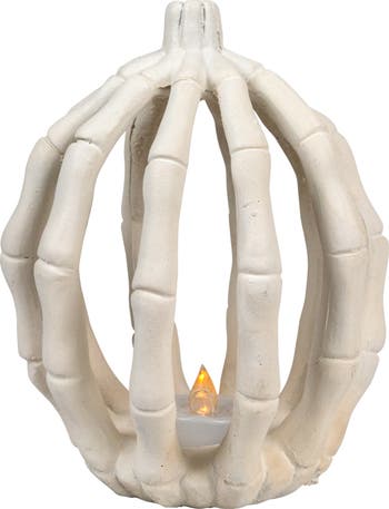 Dark nights and spooky frights fill the Halloween air. Skeleton fingers make up this lighted, creepy illusion, pumpkin. This will make the perfect addition to your tabletop, mantle, shelves, or anywhere you want to add that frightening touch. Product Features: LED skeleton pumpkin decoration Features skeleton fingers shaped like a pumpkin Accented with LED lighting On/Off switch located at the bottom Battery operated For indoor use only Dimensions: 6.25" high by 4.75" diameter Material(s): polyresin