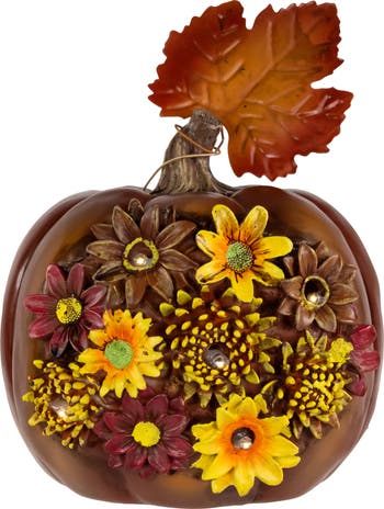 Put a different spin on your autumn decor with this solar-powered pumpkin. This pumpkin is pre-lit with 5 white LED lights and wildflower accents. This pumpkin is perfect for putting near your front door or in your garden. The ideal addition to your Thanksgiving and fall decor. Product Features: Pre-lit with 5 white LED lights LED lights use 90% less energy Solar panel is on the upper back of the pumpkin Convenient on/off switch Must be placed in an area that receives full sun for at least 8 hours a day to work properly Lights automatically turn on at dusk and off at dawn Requires 1 AA battery - included Dimensions: 8"H x 7"W x 6.5"D Material(s): polyresin