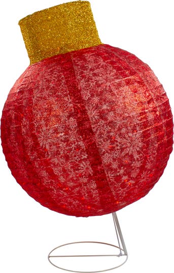 Glistening like the starlit night sky, this onion ornament is a stunning addition to your holiday decorations. Adorned with delicate white snowflakes against a backdrop of red tinsel fabric, it comes with twinkling lights for added enchantment. Its collapsible design makes it incredibly easy to set up and store, ensuring convenience year after year. Whether placed indoors or outdoors, this durable ornament brings joy to your decor throughout the holiday season and beyond. Product Features: Pre-lit with 100 lights Bulb size: micro fairy Bulb type: LED Random twinkling lights 16 clear lead wire Additional product features: LED lights use 90% less energy Cool to the touch Some assembly required Collapsible construction for easy storage Ground stakes and cable ties included UL approved and certified for indoor or outdoor use Adapter: 4.5V/3.6W Dimensions: 38" high x 26" in diameter Material(s): metal/tinsel fabric/wire