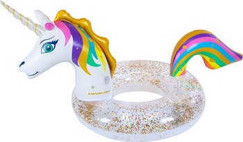 The LED Unicorn Glitter Ring shines bright and colorful. Filled with unicorn shaped glitter and with LED lights inside the horn, it s sure to bring magical fun to the pool. Designed with a clear top and multi color mane and tail. Who doesn t want to ride a unicorn, even in the pool! Requires 2 CR 2032 batteries, not included. Suitable for ages 4 years and up. Weight capacity of 200 lbs. Use only under competent adult supervision.