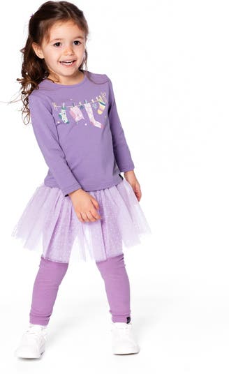 A tulle skirt overlay adds texture and whimsy to these oh-so-essential bottoms. A must-have for the girly girl who loves the comfortable feel of leggings, this adorable one-piece design features a stretch elastic waistband, a vertical ribbed texture, and a flared tulle skirt with an allover dot pattern.
