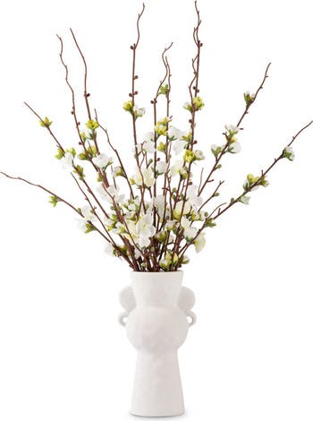 Elegant and minimalist, the Leif Quince Bud Pedestal Arrangement showcases the delicate beauty of white quince buds in full bloom. Set in a sleek white pedestal cement vase, the sculptural design enhances the natural beauty of the florals, making this arrangement a striking focal point in any room. With its timeless simplicity, this piece exudes understated sophistication, effortlessly elevating your space. A lasting luxury, timeless and unrivaled.