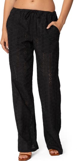 Dainty, airy eyelet details lend a semisheer effect to these effortlessly cool drawstring pants made with wide legs.