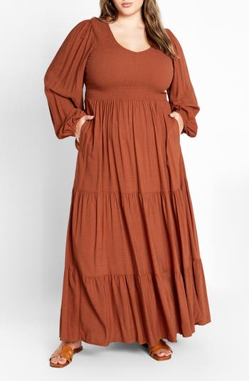 A sweetly smocked bodice gives way to rows of ruffles in a prairie-pretty maxi painted in an earthy hue and perfected with a pair of pockets.