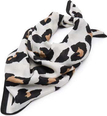 Herringbone-weave satin lends subtle texture to an outfit-completing scarf splashed with bold leopard spots.
