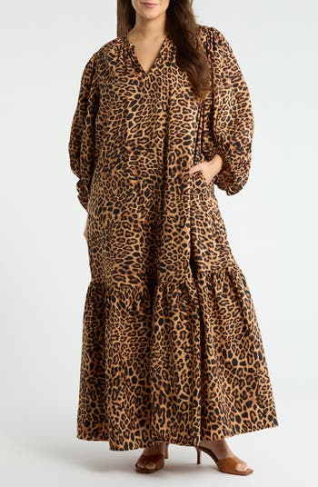 A forever-on-trend leopard print makes a fierce statement on this breezy shift dress styled for an easy fit with elbow-length balloon sleeves.