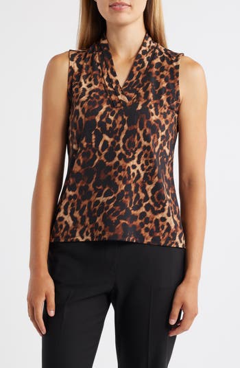 An always classic leopard print and pleats at the V-neckline bring polished style to a soft knit top that goes from desk to dinner with ease.