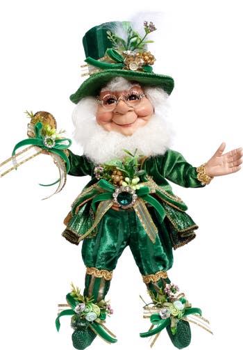 This Leprechaun Elf (Small – 11 Inches) is a charming collectible figure dressed in rich green velvet adorned with gold trim, ribbons, and jeweled accents. His cheerful face, framed by a fluffy white beard and round glasses, gives him a friendly, whimsical personality. Perfect for St. Patrick’s Day décor or as a festive keepsake, he brings a touch of Irish luck and sparkle to any setting.