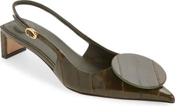 Opposites unite on this mismatched pair of eelskin slingback pumps—one set with a circle, the other, a square—atop the sharply pointed toe. A flat back is flush with the shoe-width kitten heel.