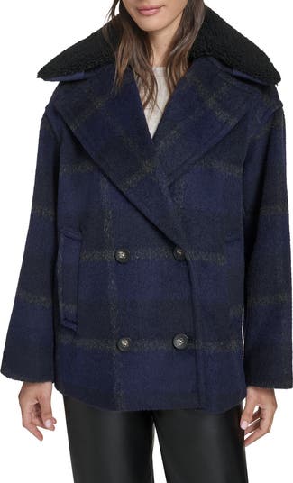 Layer on this earthy plaid double-breasted coat that delivers an ultracozy feel with a removable faux-shearling collar and a soft, brushed finish.