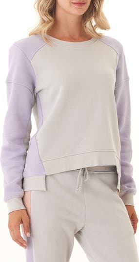 Soften your weekend stance with the pastel shades and plush cotton-blend fleece of this sweatshirt finished with a purposefully mismatched hem.