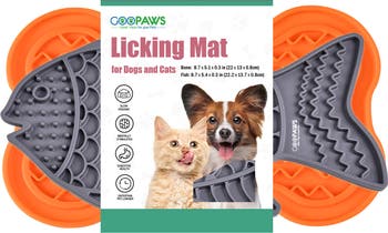 LICKING MAT: 2PK - ORANGE GREY - The GOOPAWS Silicone Treat Lick Mat is a fun way to treat your dog or distract them when needed. These dog lick mats are normally constructed of flexible food-grade silicone or rubber and can be smeared with soft foods like peanut butter, yogurt, or your dog s wet food. With an uneven surface structure, the dog lick mat with suction cups scrapes food particles off the pet s tongue and protects gum health. Enjoy hassle free cleanup. Once your dog is all done, throw it in the top rack of the dishwasher for easy cleaning! Our durable Licking mats for dogs and cats are fun way to develop healthy eating habits. These dog lick mats will not cause you to fall or slip! These lick mats for dogs large are manufactured with very powerful suction cups that can stick to tile, porcelain, or glass for up to 24 hours. KEY BENEFTITS: Encourages slow eating habit aiding in digestion and reducing the risk of bloating. Increases saliva production to improve oral health. SAFE TO USE: Made from high-quality, non-toxic silicone. LICKING MAT SIZES: Bone Size: 8.7"x5.1"x0.3", Fish Size: 8.7"x5.4"x0.3"
