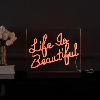 Bright neon makes a whimsical addition to your bookshelf or gallery wall. Whether you want to have a playroom or a room dedicated for inspiration, our Life Is Beautiful sign is quite the sight for starry eyes. Convenient, low-voltage USB power is perfect for a bedroom or dorm room.