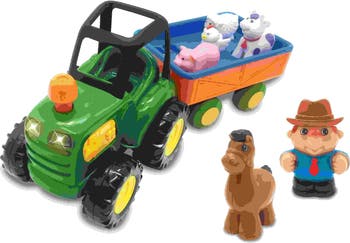 LIGHT N SOUND: FARM TRACTOR - Motorized tractor moves forward and auto-stops. Press steering wheel to hear revving engine and horn sound. Put animals in place and press down to hear their realistic animal sounds. Removable farmer and 5 farm animals for imaginative play. Encourages Imaginative Play: With its interactive features and realistic details, the farm tractor inspires imaginative storytelling and role-playing adventures on the farm. Durable Construction: Built from sturdy materials, the farm tractor is designed to withstand rough play and ensure long-lasting enjoyment for young farmers. Overall, the "Light N Sound: Farm Tractor" offers a dynamic and engaging play experience that stimulates children s creativity and provides hours of farm-themed fun. INCLUDES: 1 tractor with trailer, 5 animals, 1 farmer.