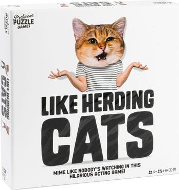 LIKE HERDING CATS - The cat-astrophic acting game! In each round, the cats don cat-mask blindfolds and act out one of two clues – but there’s a cat-ch. When acted out, they may appear quite similar! The herders then group the cats and guess what they were acting. Work together to win as many cards as you can in five rounds. Unique and grammable cat-mask blindfolds mean nervous actors can let loose their inner dicat-rio and mime like no-one’s watching! It’s the purrrfect answer to charades! JUST LIKE CHARADES, BUT WITH CAT MASKS! Don the cat mask blindfolds and lose your inhibitions, this game gives charades the silent disco effect! Even the shyest of actors can let loose in this hysterical party game. Set loose your inner Leonardo Di-Cat-Rio in this hysterical acting party game! Step 1) Most of the players will be cats, they will get 1 of 2 similar things to act out. Step 2) The cats perform their action while wearing cat masks, so they can t see what the others are doing. Step 3) The non-cat players are the herders. They group the cats and guess what they were acting. Can you tell the rollers from the rowers? Work together for the PURR-fect score! OVERVIEW: A hilarious charades-style party game. Larger than life cat-masks to wear as you re acting. Cooperative game play, encouraging players to work as a team. The masks and the focus on working together take the pressure off your acting skills! Ages 10 and up, for 3 to 10 players, 30 min gameplay.