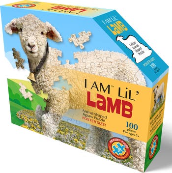 Madd Capp’s 100-piece I AM LiL’ LAMB has a unique, animal-shaped border! No square corners, no straight edges… just a little extra challenge and a lot more fun (about an hour, depending on your skill level). Puzzle pieces are oversized for easy handling. The finished puzzle is poster-sized (32” x 22”) and – with a semi-gloss, photo-realistic image – pretty impressive looking! Included with each puzzle is an “extra” – an educational Fun Facts booklet. On one side is all kinds of interesting info about the animal you’re puzzling. On the flipside is a full puzzle image to use as a reference or hang as a poster. Packaged securely in Madd Capp’s signature five-sided box, puzzles are designed to be displayed on a shelf, just like books in a library. For ages 5 and up.