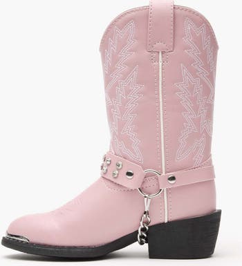 If your child is the epitome of a girly girl, you must get her a pair of these Durango Little Kid Western boots. The pink upper is as cute as can be and made from a synthetic leather-like material, which is ideal for a children s boot thanks to its high durability and easy-to-clean surface. Decorative stitching, white piping along the shaft and collar, a metal toe rand, and a removable rhinestone strap all combine to give this boot an extra-special, sparkly look.Helpful features like the dipped topline and sturdy pull tabs make it easy for your child to pull these boots on and off without assistance. Inside, a cushioned insole and heel pad ensure all-day comfort and support for growing feet.This boot features a classic R toe (round toe), offering a timeless Western shape. A steel shank is built in to deliver reliable arch support and enhance overall stability. Underneath, the black PVC outsole offers long-lasting durability while complementing the pink upper beautifully. A 1 heel, making it stylish yet practical for steady walking.If you want your little girl to step out in style and stay comfortable, these adorable Durango Little Kid Pink Rhinestone Western Boots (#BT568) are the perfect fit!