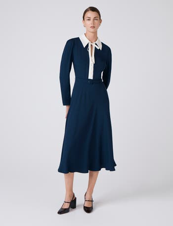 Perfectly polished is how we would describe Lilian. A long-sleeved midi dress in soft crepe with a contrast pointed collar, neck tie and placket featuring covered buttons. A fabric-covered belt at the waist creates definition, leading into a flowing skirt for a refined, elegant look. Perfect for work or formal occasions. Concealed side zip fastening.